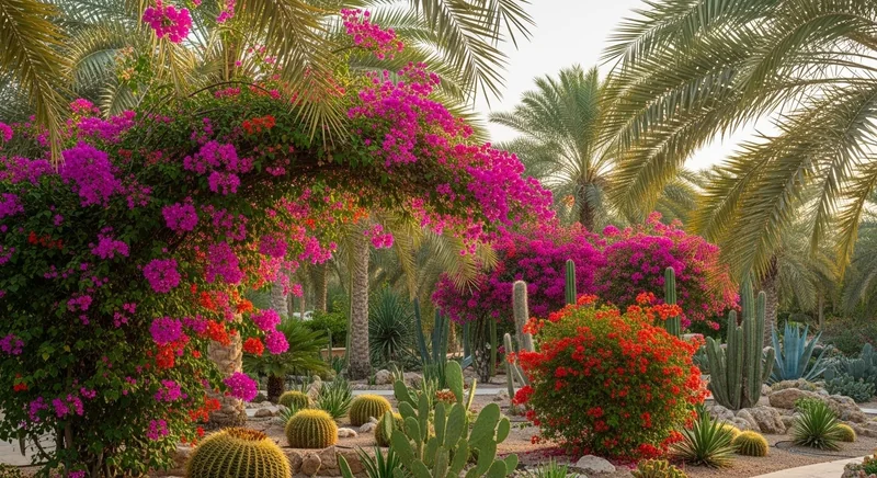 Climate-Resilient Plant Selection: In Bahrain's arid climate, choosing the right plants is crucial. Species like Bougainvillea, Frangipani, and Date Palm thrive with minimal water and offer vibrant colors and textures. These plants not only enhance the garden's beauty but also ensure sustainability.